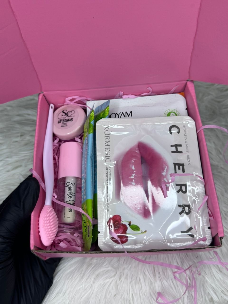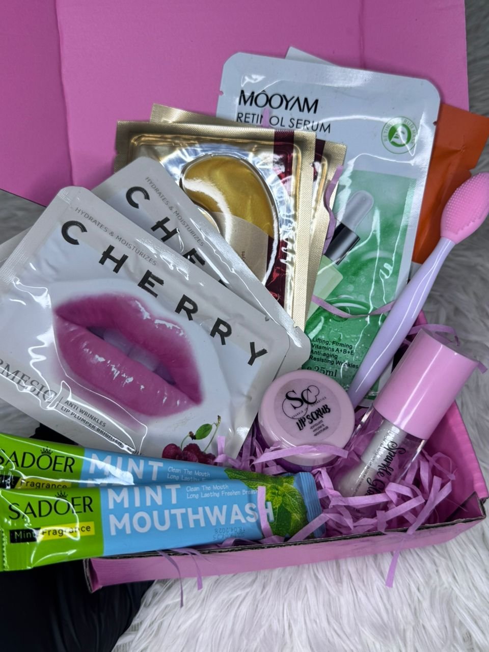 1 lipgloss, 1 lip scrub, 1 lip brush, 2 facemask, 2 eyemask, 2 lip mask and 2 sachets of mouthwash