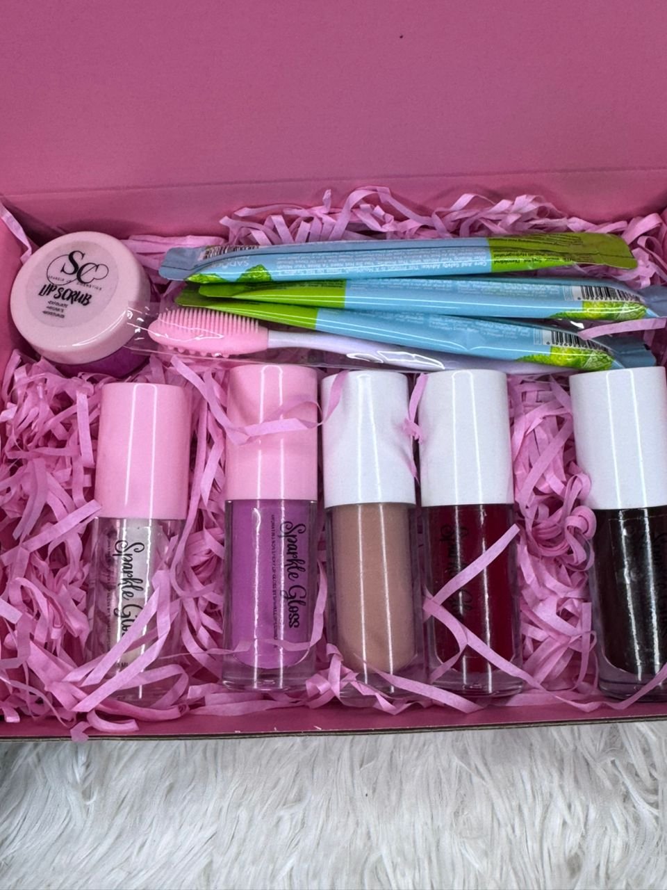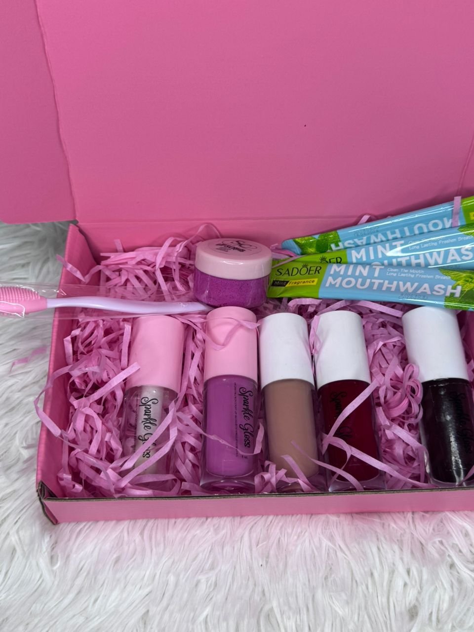 5 lip glosses, 1 lip scrub, 1 lip brush and 3 sachets of mouthwash